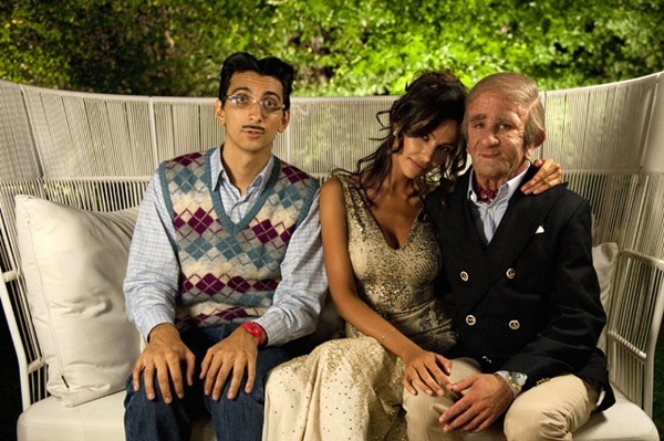 When the yucky old man Ruggero (played in heavy makeup to appear much older by Francesco Mandelli ) finds out that his educated and sensitive son (Fabrizio Biggio ) is about to marry for love (we never see the bride to be, but she’s evidently not very pretty) Ruggero sets forth to postpone the wedding and get his virgin son laid. And not just laid – LAID – he’s got a scheme, and a bet, and the goal is to get his son in bed with a beautiful lingerie model.