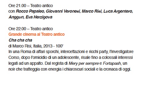 Marco Risi’s Cha-Cha-Cha: In a Rome of dirty business, wire tapping and *rich parties?* (help me out here, anyone, I don’t get this translation), Investigator Corso, after the murder of a teenager, follows the trail to a contract from high up. From the director of Mery Per Sempre and Fortapash, a film noir that energetically paints the social chiaroscuro and the news of today. (Stars Luca Argentero)