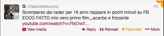 “Missing from the radar for 16 years and reappears in a few minutes on Facebook. Ecco Fatto (There, It’s Done) my truly first film…raw and sparkly,” tweeted director Gabriele Muccino yesterday. The film, starring Barbora Barbulova and Claudio Santamaria can be found on YouTube. Tweet Muccino (G) and tell him if you enjoy it!